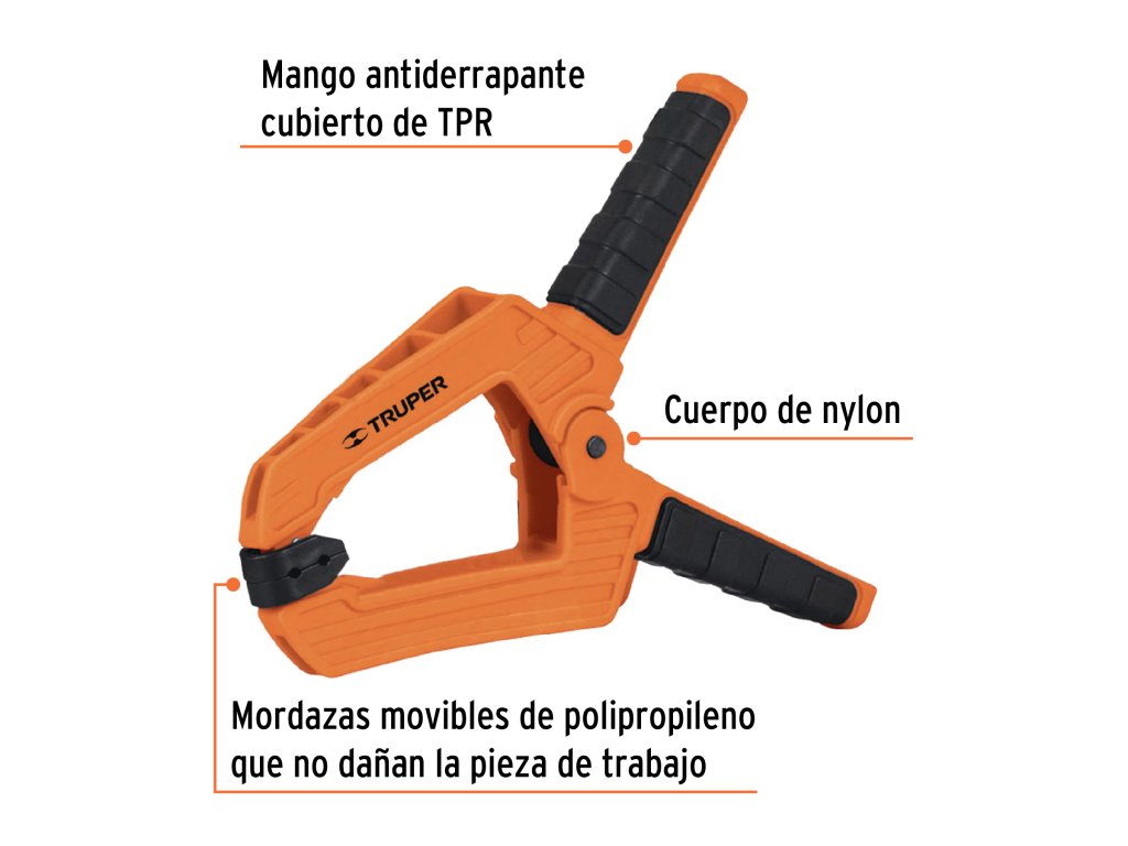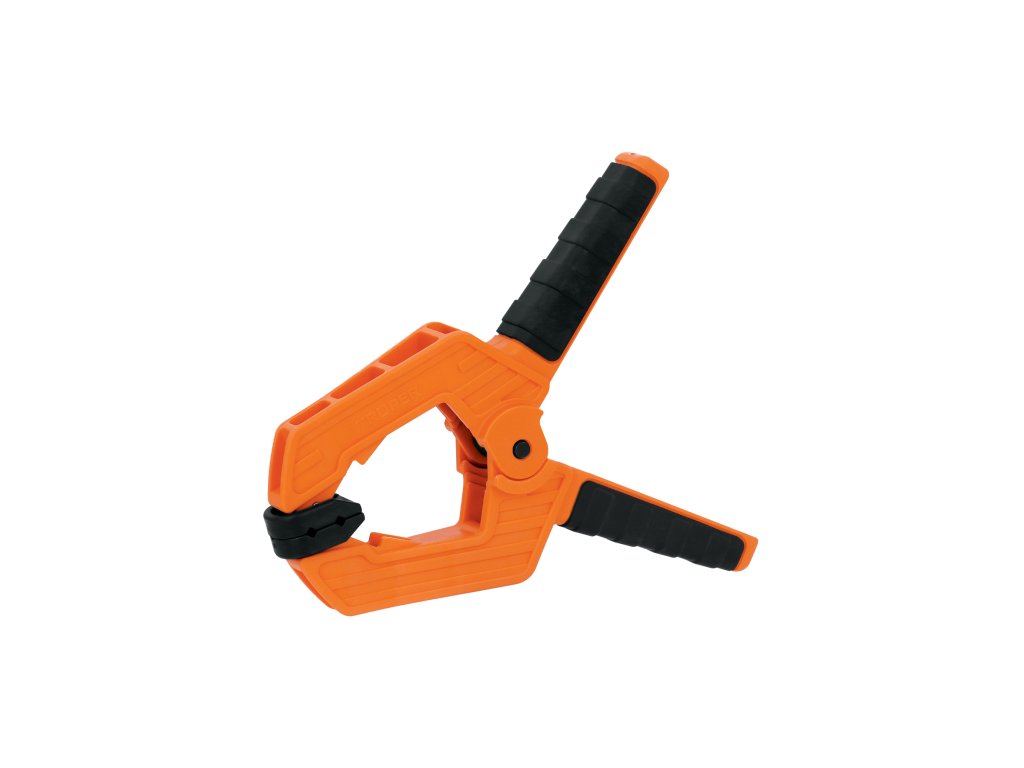 TRUPER – Pružinová svorka PRE-6: odolná svorka s nylonovým telom, protišmykovou TPR rukoväťou a pohyblivými čeľusťami, vhodná na rýchle a bezpečné upnutie materiálu bez poškodenia povrchu.